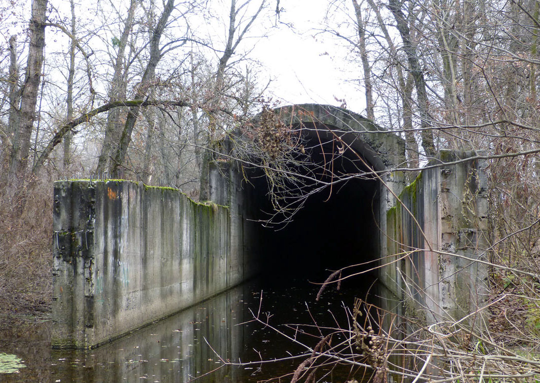 Кстати, все говорят об объекте на Оболони, зато мало кто знает о том, что брат-близнец Оболонского кессона находится на Осокорках. Он представляет собой полузатопленную туннельную секцию, наполовину погруженную под землю.
