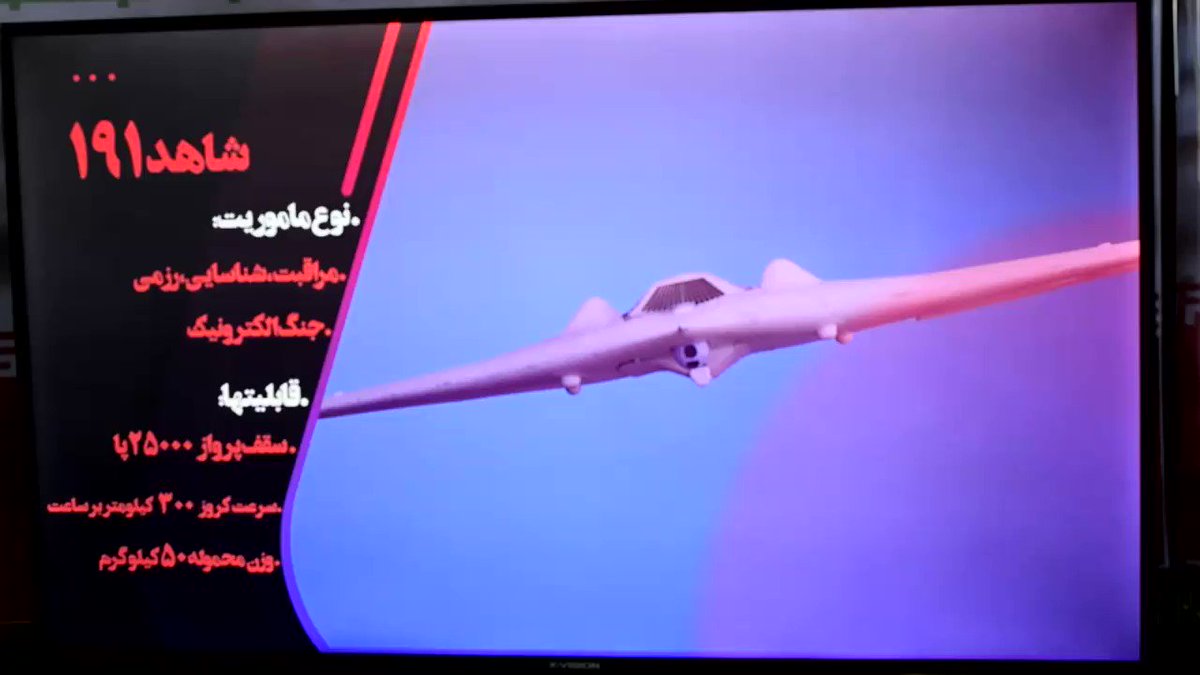 Shahed-191 тоже не оригинальная разработка – это, фактически, клон американского RQ-170 Sentinel, захваченного в 2011 году. Несмотря на наличие реактивного двигателя, его характеристики более скромные, чем у Shahed-129. Автономность всего 4,5 часа, радиус боевого применения – до 450 км. Основное вооружение – две бомбы Sadid-342 – вариант все той ракеты Toophan с телевизионным наведением.