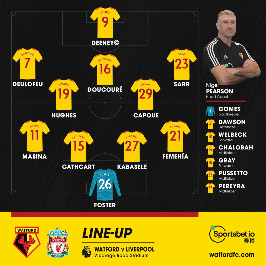 "Уотфорд": Фостер, Фемения, Кэткарт, Кабаселе, Мазина, Дукуре, Капу, Хьюз, Сарр (Пуссетто, 82), Дини, Деулофеу (Перейра, 37).