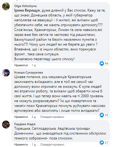 "Очень странный у вас список. Говорю за то, что знаю: Донецкая область, в которой губернатор настаивал на эвакуации, ее жители, выехавшие чтобы обезопасить себя, не должны получать помощь? Славянск, Краматорск, Лиман и села вокруг, которые сейчас уже без света и частично под рашистами, Бахмутский район и множество населенных пунктов из него? Почему этих людей вы не принимаете во внимание? Уверена, что и в других областях, затронутых фронтом, такая же ситуация. Требуем просмотра этого списка", - пишет Ольга Волошина в комментарии под постом Ирины Верещук.