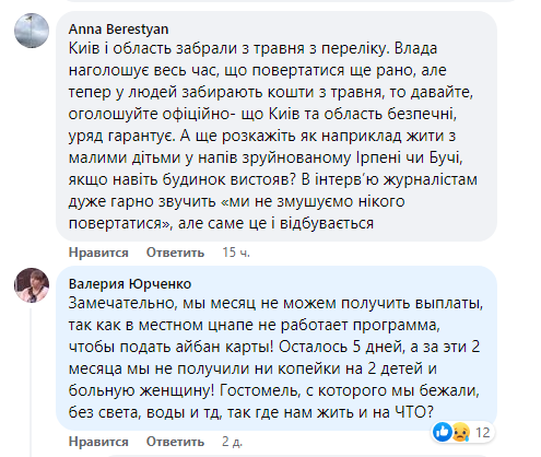 "Киев и область забрали с мая из перечня. Власть отмечает все время, что возвращаться еще рано, но теперь у людей забирают средства. Так, давайте, объявляйте официально, что Киев и область – безопасны, правительство гарантирует. А еще расскажите, как, например, жить с малыми детьми в полуразрушенном Ирпене или Буче, если даже дом выстоял? В интервью журналистам очень хорошо звучит "мы не заставляем никого возвращаться", но именно это и происходит", - пишет Анна Берестян.