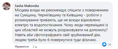 "Местные власти не рекомендуют спешить с возвращением на Сумщину, Черниговщину и Киевщину - работы по разминированию продолжаются, еще не повсюду возобновлены электро- и водоснабжение. Почему перемещенные люди из этих областей не могут рассчитывать на помощь? Даже чтобы сфотографировать свой разрушенный дом, людям нужно было бы вернуться туда физически", – добавляет Александра Маковская.