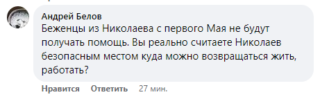 "Беженцы из Николаева с первого мая не будут получать пособия. Вы реально считаете Николаев безопасным местом, куда можно возвращаться жить, работать?", - спрашивает местный житель Андрей Белов.