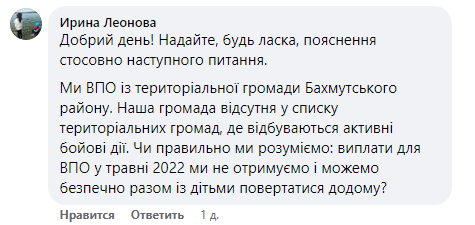 "Добрый день! Предоставьте, пожалуйста, объяснения по следующему вопросу. Мы ВПЛ из территориальной общины Бахмутского района. Наша община отсутствует в списке территориальных общин, где происходят активные боевые действия. Правильно ли мы понимаем: выплаты для ВПЛ в мае 2022 года мы не получаем и можем безопасно вместе с детьми возвращаться домой?", - спрашивает Ирина Леонова.