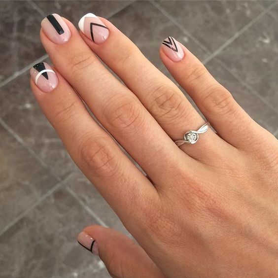 Можно поэкспериментировать и с геометрией. В этом случае после процедуры бразильского маникюра нанесите покрытие и сделайте аккуратные геометрические линии или точки.
