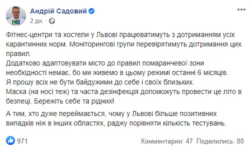 "Фитнес-центры и хостелы во Львове будут работать с соблюдением всех карантинных норм. Мониторинговые группы будут проверять соблюдение этих правил. Дополнительно адаптировать город к правилам "оранжевой" зоны необходимости нет, потому что мы живем в этом режиме последние 6 месяцев", - написал в Facebook городской председатель Львова Андрей Садовый. Такое решение приняла Львовская городская комиссия по вопросам ТЭБ и ЧС.