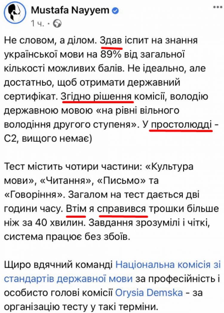 Качество тестирования, которое проводит Нацкомиссия, также вызывает вопросы. Бывший нардеп Мустафа Найем, недавно назначенный на должность замминистра инфраструктуры, похвастался у себя в Facebook успешной сдачей экзамена на знание украинского языка. При этом он в одном небольшом посте допустил целый ряд ошибок, вызывающих сомнения в его знаниях государственного языка.