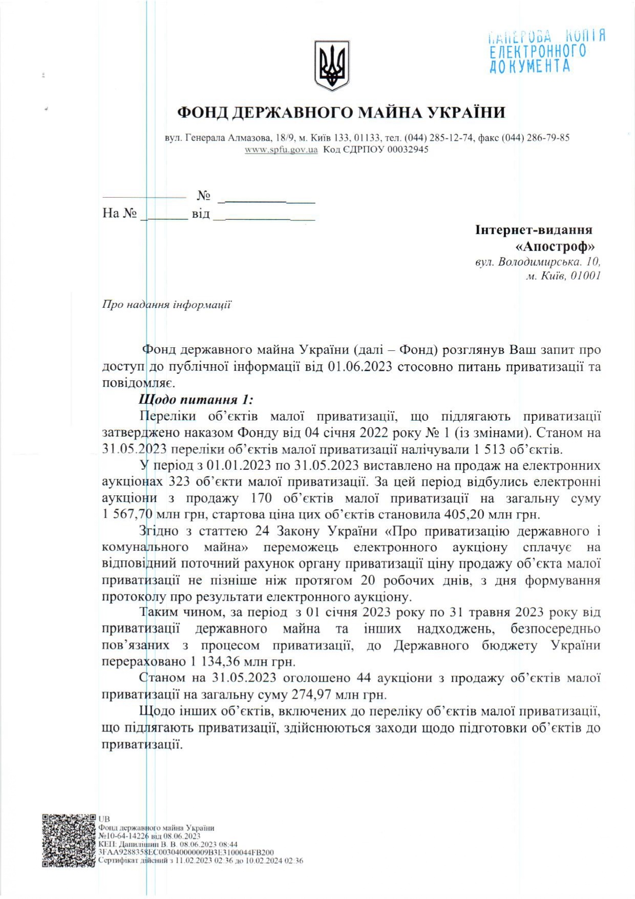 "За период с 1 января 2023 года по 31 мая 2023 года от приватизации государственного имущества и других поступлений, непосредственно связанных с процессом приватизации, в государственный бюджет Украины перечислено 1 134,36 миллиона гривен", - говорится в официальном ответе ФГИ на запрос издания.