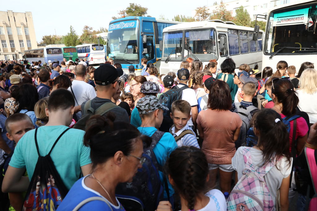 Родители эвакуируют детей из города Армянска после аварии на заводе Титан, 2018 год