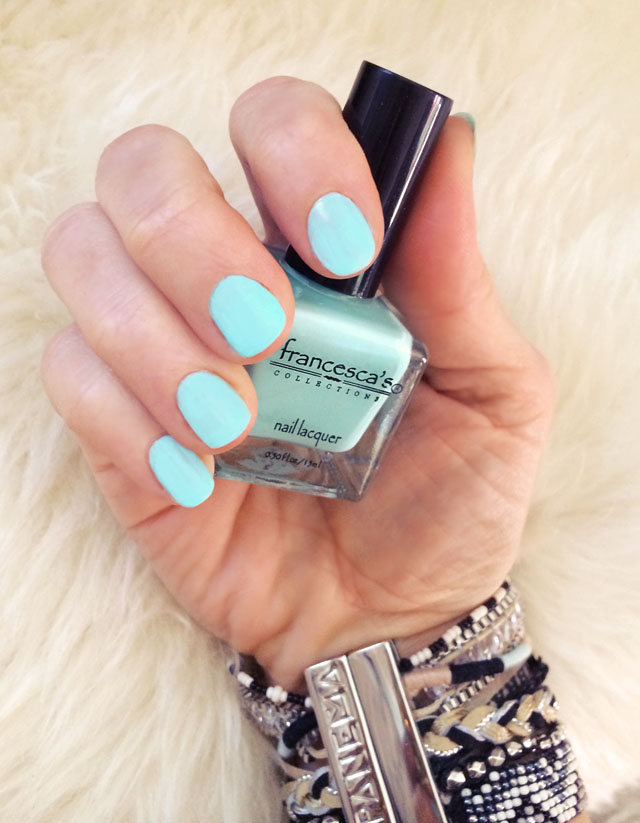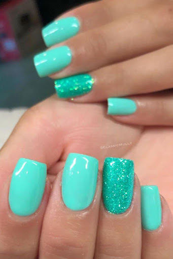 Мята очень хорошо смотрится с блестками, поэтому не стоит бояться их использовать. Но в том случае, если вы любите классику, можно просто покрыть ногти лаком одного цвета. Мятный сам по себе достаточно яркий, поэтому может обойтись без каких-либо дополнений.