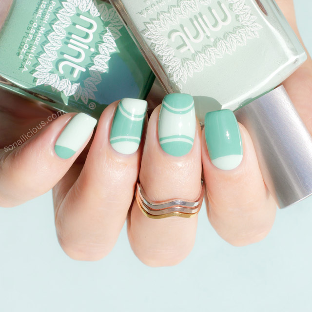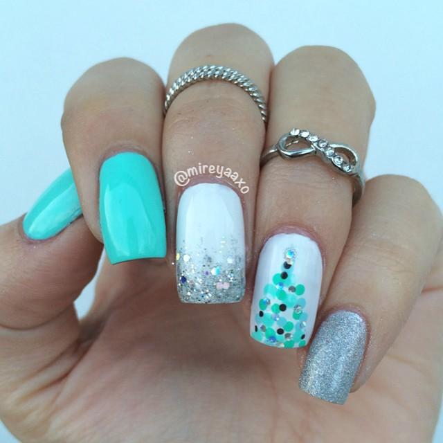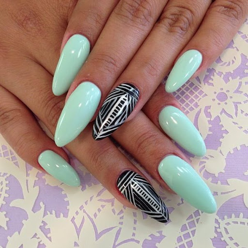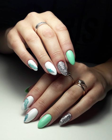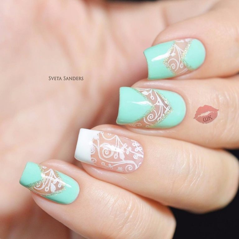Мятный цвет хорошо сочетается с контрастными узорами. Также можно оригинально дополнить маникюр блестящими акцентами.