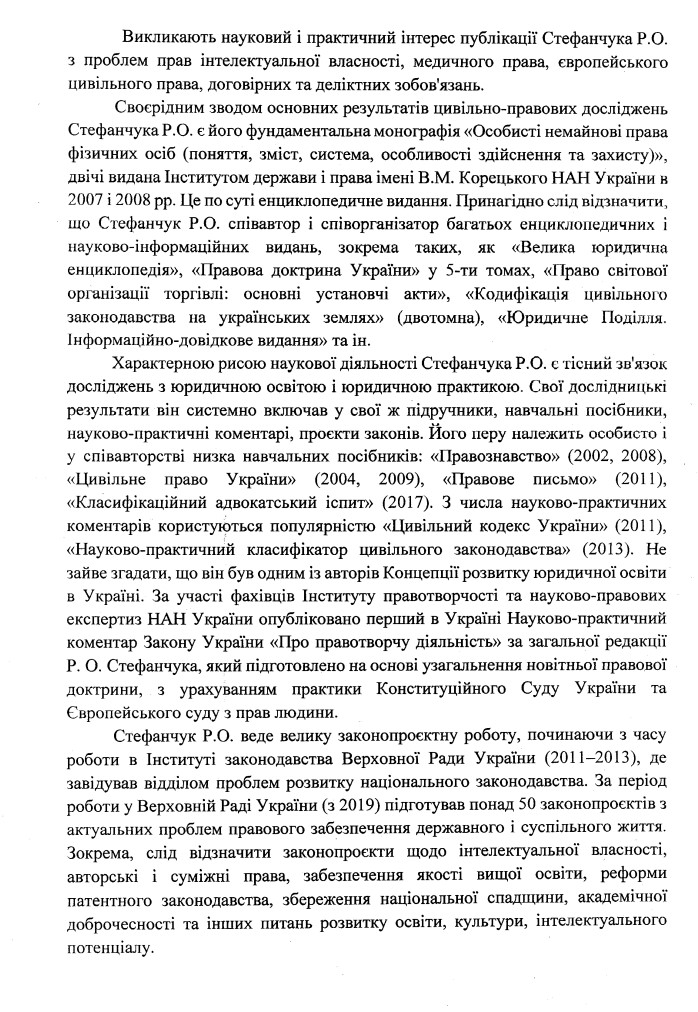 "Которые свидетельствуют о существенном вкладе в развитие теории и практики гражданского права, – отмечают в НАНУ, – Вызывают научный и практический интерес публикации Стефанчука Р. А. по проблемам прав интеллектуальной собственности, медицинского права, европейского гражданского права, договорных и деликтных обязательств" .