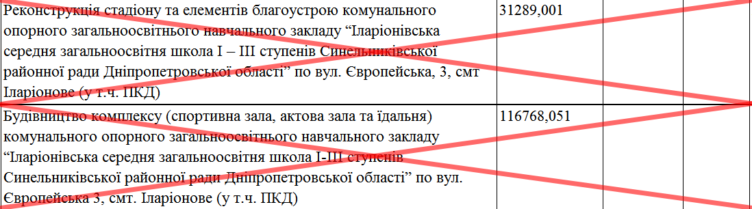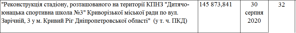 Один из наиболее вопиющих примеров – стадион ДЮСШ № 3 в Кривом Роге изначальной стоимостью более 145 млн. грн. На начало 2019 года объект имел строительную готовность – 32% и по плану работ должен был быть сдан в эксплуатацию 30 августа 2020 года. Сейчас это практически заброшенный объект, на котором делают вид, что работают около десятка человек.