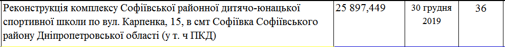 Еще один пример – реконструкция ДЮСШ в Софиевке. На середину 2019 года объект имел строительную готовность – 36% и по плану работ должен был быть сдан в эксплуатацию 30 декабря 2019 года. По состоянию на сегодня строительство стадиона полностью остановлено.