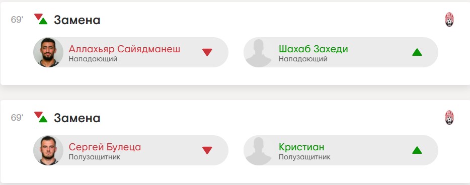 Заря: 53. Мацапура - 32. Имереков, 45. Фаворов, 4. Цвек, 7. Кочергин, 10. Хомченовский, 23. Булеца, 28. Громов, 29. Назарина, 22. Кабаев, 90. Сайядманеш
