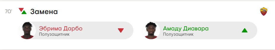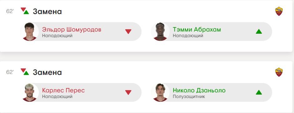 Запасные: 87. Фузато, 5. Винья, 19. Рейнолдс, 23. Манчини, 77. Мхитарян, 8. Вильяр, 42. Диавара, 52. Бове, 22. Дзаньоло, 59. Залевски, 9. Абрахам, 21. Майораль