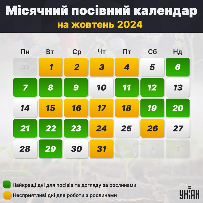 27-29 октября – в эти дни успешно пройдет посев комнатных и тепличных растений. Также удачными будут посадка молодых деревьев и кустарников, перекапывание почвы, удаление сорняков и поросли, обработка участка от вредителей. Можно покрыть цветы и овощные грядки укрытием на зиму.