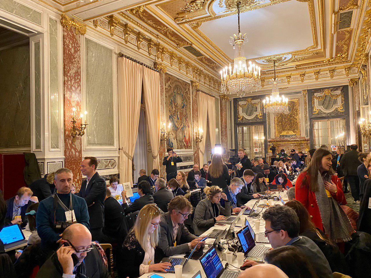 18:15 Так сейчас выглядит пресс-центр Елисейского дворца. Всего на саммите аккредитовано более 300 журналистов. В этот зал влезли не все.