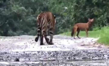 Тигр атакует: в сети появилось уникальное видео с перепуганным красным волком