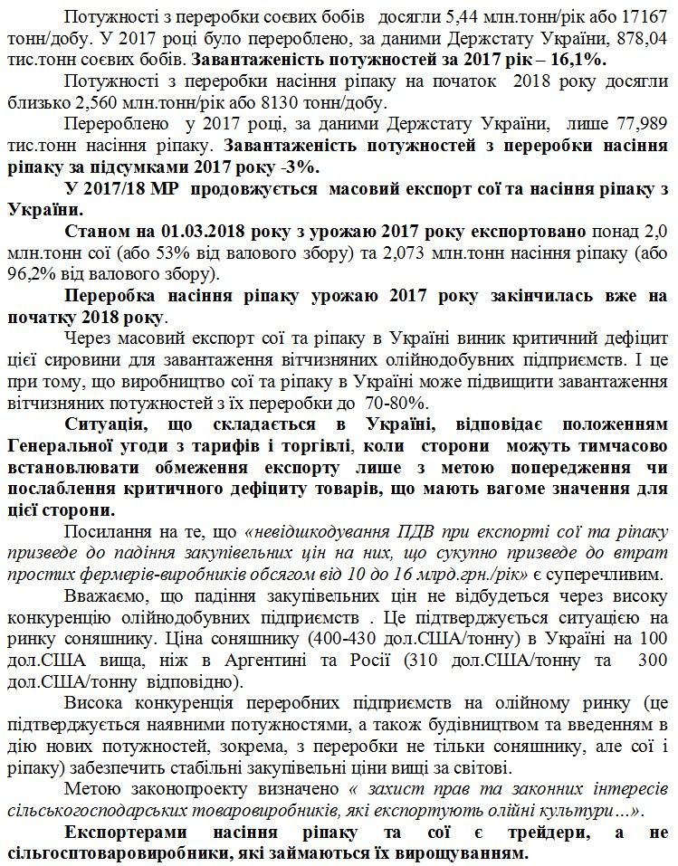 "Целью законопроекта определено "защита прав и законных интересов сельскохозяйственных товаропроизводителей, экспортирующих масличные культуры...". При этом экспортерами сои являются западные трейдеры, а не украинские сельхозтоваропроизводители, которые выращивают зерновые. Таким образом, данный законопроект защищает только интересы иностранных трейдеров, которые и являются основными экспортерами сои и рапса и заинтересованы в получении "быстрых денег", уверены производители.