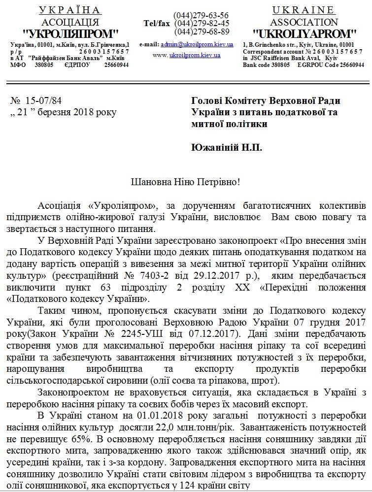 "В случае принятия данного законопроекта (регистрационный № 7403-2 от 29.12.2017 г.) Украина теряет возможность наращивать производство и экспорт продуктов с высокой добавленной стоимостью. Экспортируя ежегодно около 5 млн тонн масличных, за границу вывозится добавленная стоимость в виде переработки, а это 50 долл на тонне или 250 млн.долл. США (7 млрд гривен), которых лишатся бюджет страны", - говорится в открытом письме ассоциации "Укролияпром".