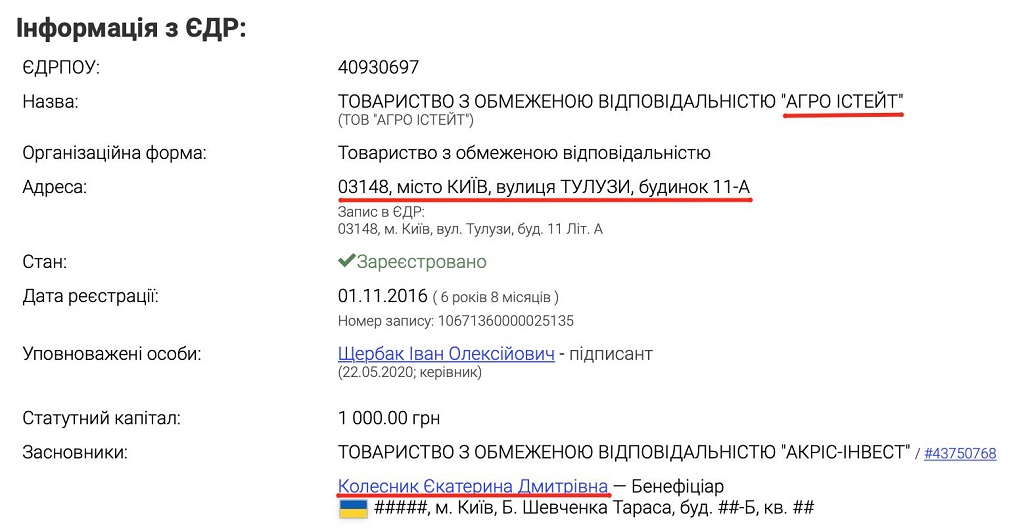 В подтверждение слиянию агробизнесов Медведчука и Колесника издание приводит факт, что ряд ключевых предприятий АСТ-холдинга Колесника ООО "Агро Истейт", ООО "Инновагро", ООО "Технагро", ООО "Монтеверде" стали иметь общий юридический адрес с агропредприятиями Медведчука, которые зарегистрированы на ул. Тулузы 11-А в Киеве. Физически найти здание или помещение по этому адресу невозможно, и журналисты указали, что это "яма" для регистрации предприятий.