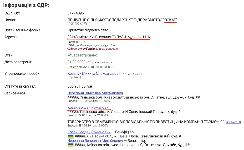 Фото - адрес регистрации ЧСП "Оскар" Медведчука
