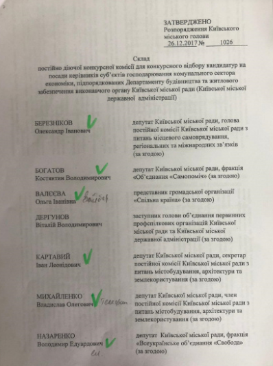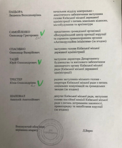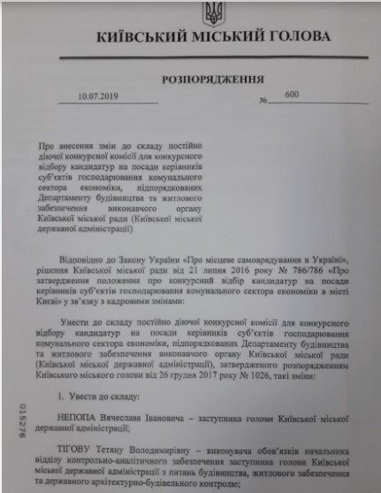 "Несмотря на то, что назначение этих членов комиссии - прерогатива департамента, ни в распоряжении, ни в сопровождающих документах не было никаких объяснений, почему в комиссию вошли замглавы КГГА Вячеслав Непоп, и. о. начальника отдела контрольно-аналитического обеспечения замглавы КГГА Татьяна Тигова, начальник юридического управления департамента Иван Федорчук, а замглавы КГГА Александр Спасибко, Людмила Пацьора и замдиректора департамента Юрий Таций из комиссии выведены. Ведь их статус за последнее время никак не изменился", - отмечает Ковальчук.