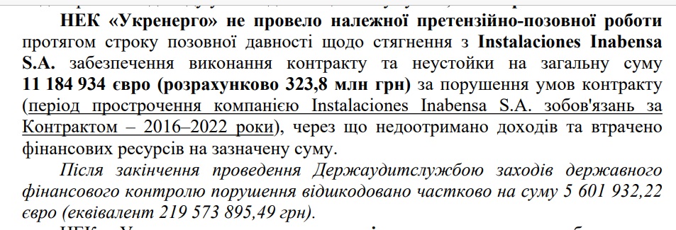 "Отсутствие контроля со стороны "Укрэнерго" и не проведение корректировки стоимости контракта на сумму 183 357 591,28 грн (149 842 050,60 грн + 33 515 540,65 грн), возникшее в результате разницы между средствами, уплаченными НЭК "Укрэнерго" "в пользу представительства Inabensa SA и фактической стоимостью работ, выполненных субподрядными организациями, что в свою очередь привело к излишним расходам НЭК "Укрэнерго", – говорится в акте ГАС.