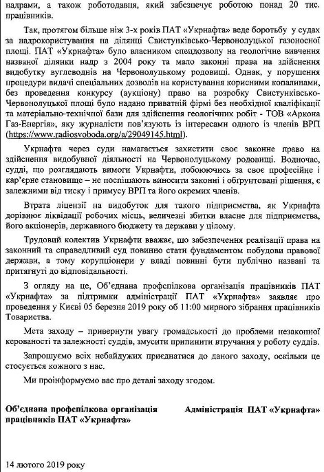 Объединенная профсоюзная организация работников ПАО "Укрнафта" 5 марта 2019 года проведет единый митинг с целью прекращения незаконного влияния, давления и вмешательства в работу судей одним из членов Высшего совета правосудия Алексеем Маловацким.