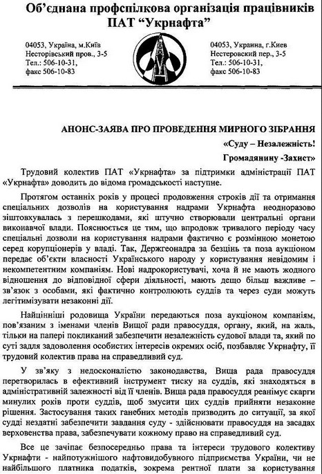 "Трудовой коллектив "Укрнафты" считает, что обеспечение реализации права на законный и справедливый суд должно стать фундаментом построения правового государства, а поэтому коррупционеры во власти должны быть публично названы и привлечены к ответственности", - говорится в письме.