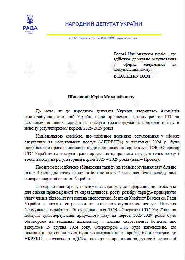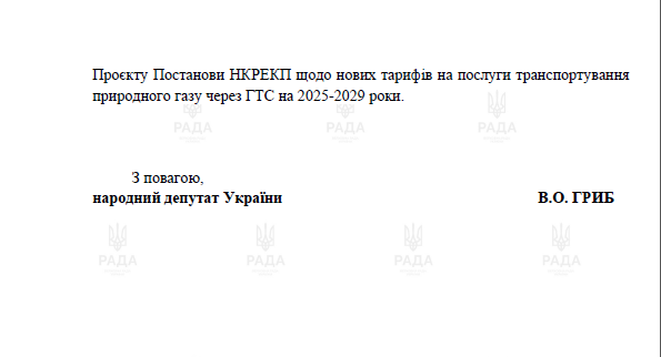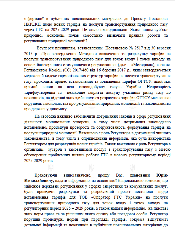 "Прошу предоставить информацию, на основе которой НКРЭКУ были проведены расчеты и разработан проект постановления по установлению тарифов для ОГТСУ на услуги транспортировки природного газа для точек входа и точек выхода на регуляторный период 2025 – 2029 годов, а также предоставить информацию, на основании каких норм права и по решению какого-либо органа или должностного лица Регулятор нарушил процедурные нормы при пересмотре тарифов, в частности отсутствие подробной информации и показателей в публичных объяснительных материалах к Проекту Постановления НКРЭКУ о новых тарифах на услуги транспортировки природного газа через ГТС на 2025-2029 годы", - говорится в письме.