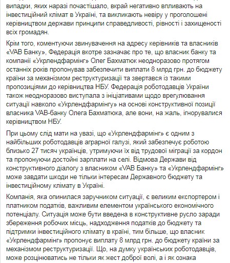"Федерация работодателей Украины неоднократно выступала с инициативами по урегулированию ситуации вокруг "Укрлендфарминг" на основе позиции владельца VAB-банка Олега Бахматюка, но они к сожалению, игнорировались руководством НБУ. Следует иметь в виду, что "Укрлендфарминг" является одним из крупнейших работодателей аграрной отрасли, который обеспечивает работой около 27 000 украинцев, удерживая их от трудовой миграции и предлагая достойные зарплаты в селе. Отказ государства от диалога с владельцем "VAB Банка" и "Укрлендфарминг" может нанести вред не только интересам госбюджета, а и инвестиционному климату в Украине", - говорится в письме.