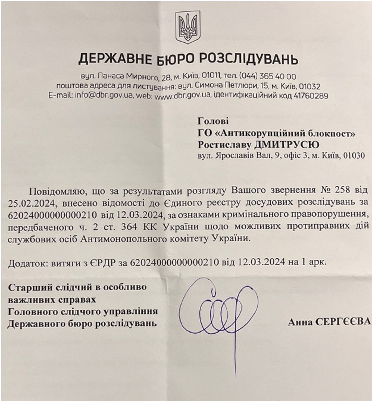Уведомление об открытии уголовного производства против чиновников АМКУ.