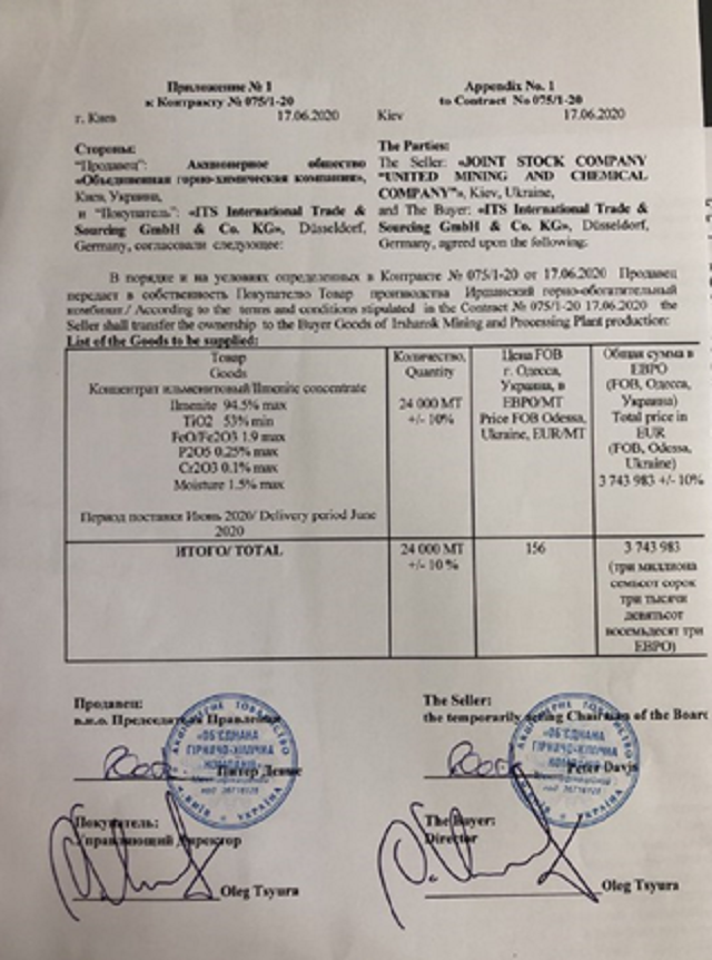 Контракт подписан 17 июня временным руководителем ОГХК Питером Девисом и директором ITS International Trade Олегом Цюрой. Ильменит приобретен с дисконтом от рыночной цены в 20-40 долл за тонну. В свою очередь, ильменит содержанием 54%, как в Иршанске, на условиях CIF продается по 260-280 долл, что соответствует цене на условиях FOB в 190-210 долл.