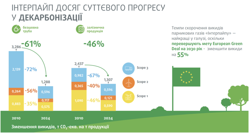 Украинская промышленная компания "Интерпайп" в 2024 году сократила удельные выбросы СО2 при производстве 1 тонны бесшовной трубы на 61%, железнодорожной продукции – на 46% по сравнению с 2010 годом.