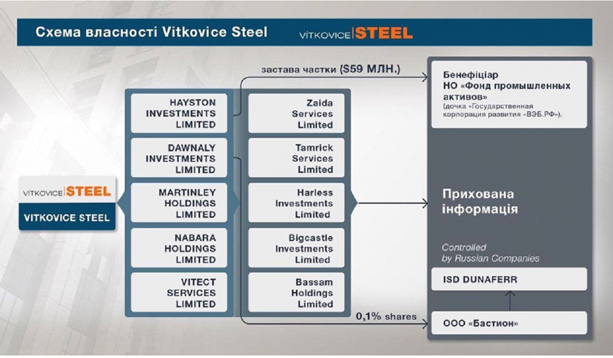 Vitkovice Steel принадлежала компании Evraz российскому подсанкционному олигарху Роману Абрамовичу. После российского вторжения в Крым и Донбасс в 2014 году, олигарх изменил структуру собственности компании – он спрятал свою долю в 5 кипрских оффшорных компаниях – Martinley Holdings Limited, Nabara Holdings Limited, Vitect Services Limited, Hayston Investments Limited и Dawnaly Investments Limited. Эта кипрская "пятерка" известна в России, поскольку связана с ВЭБ.РФ – российским государственным инвестиционным банком. Сам банк находится под западными санкциями, но его активы в Европе (как Vitkovice Steel), скрытые за офшорами, продолжают работать и оказывать влияние на европейскую экономику.