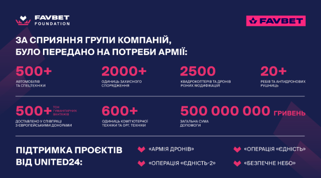 Отдельно следует отметить сотрудничество с фандрайзинговой платформой UNITED24. За последние три года фонд и компания Favbet поддержали большинство ее ведущих проектов: от закупки пикапов для инициативы "Армия дронов" до приобретения беспилотников в рамках двух этапов операции "Единство".