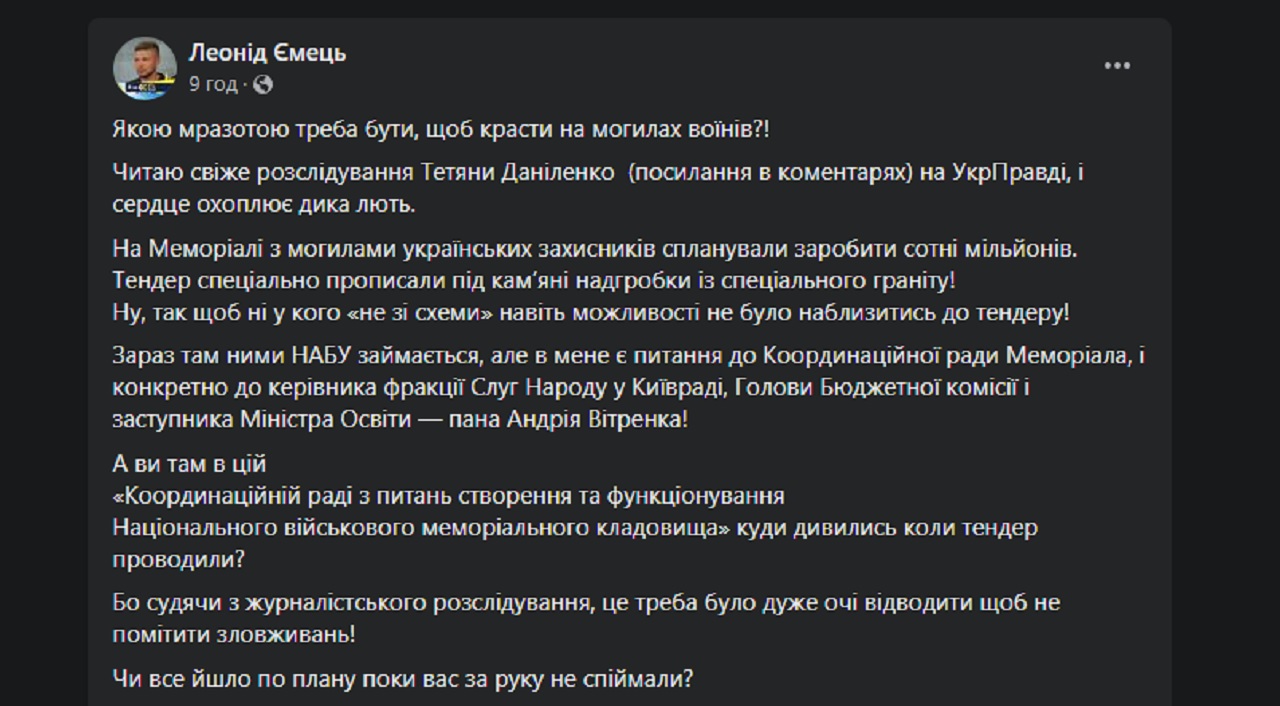"У меня есть вопросы к Координационному совету Мемориала, и конкретно к руководителю фракции Слуг Народа в Киевсовете, Председателю Бюджетной комиссии и заместителю Министра Образования – господину Андрею Витренко! А вы там в этом "Координационном совете по вопросам создания и функционирования Национального военного мемориального кладбища" куда смотрели, когда тендер проводили? Потому что, судя по журналистскому расследованию, это надо было очень глаза отводить, чтобы не заметить злоупотреблений! Или все шло по плану, пока вас за руку не словили?" - задает вопрос Леонид Емец.