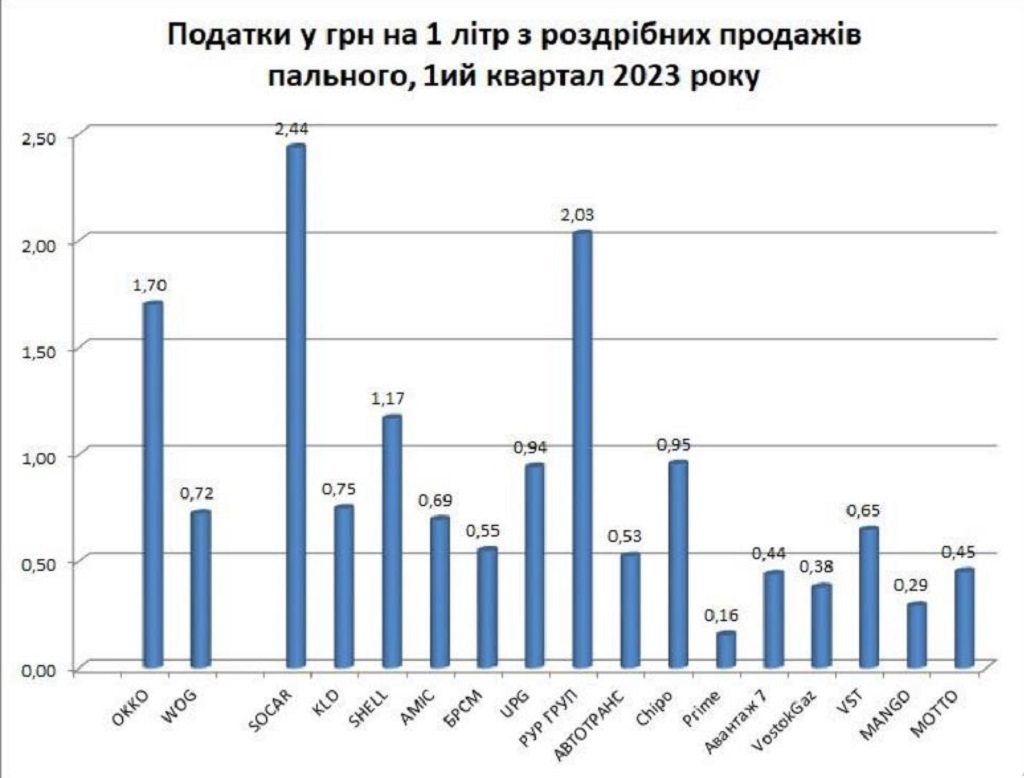 Крупнейшими налогоплательщиками в бюджет являются компании SOCAR, ОККО и UPG. Суммы уплаченных налогов по розничной продаже одного литра горючего крупнейшими сетями составляют: SOCAR – 2,44 грн, ОККО – 1,7 грн. На третьей позиции по этому показателю РУР Груп – 2,03 грн.