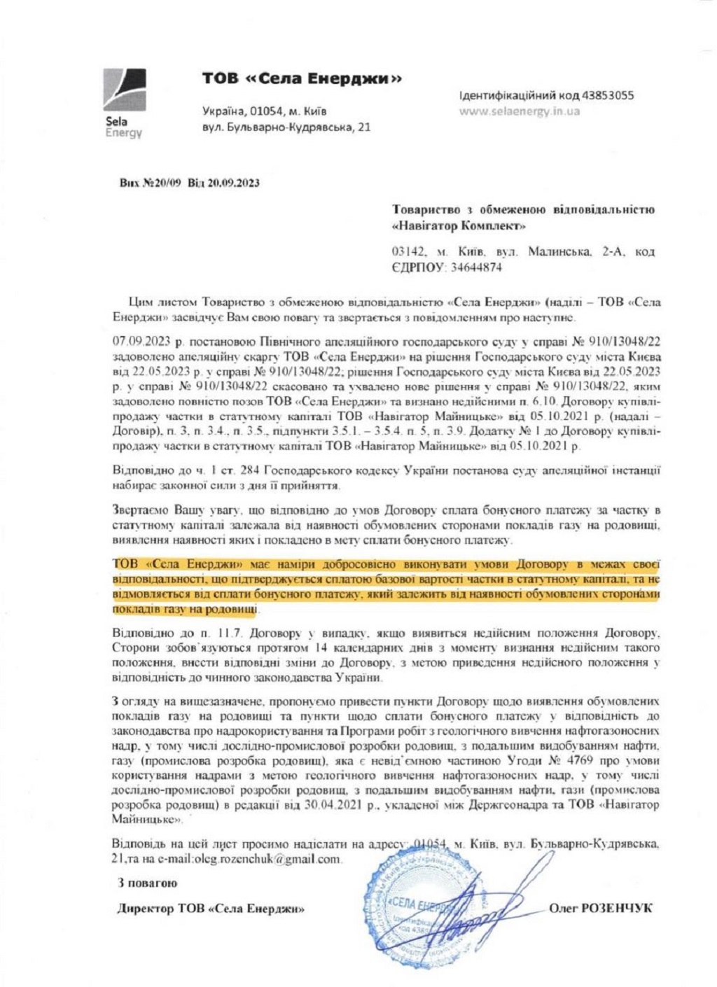 "ООО "Села Энерджи" намерено добросовестно выполнять условия Договора в пределах своей ответственности, что подтверждается уплатой базовой стоимости доли в уставном капитале, и не отказывается от уплаты бонусного платежа, который зависит от наличия оговоренных сторонами залежей газа на месторождении", – говорится в письме.