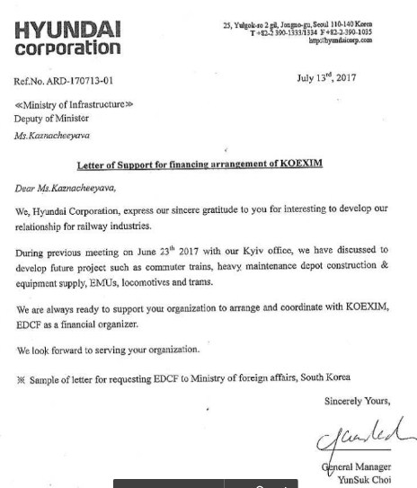 "В апреле 2019 стороны подписали протокол встречи в Сеуле, согласно которому АО "Укрзализныця" рассмотрит предложение Hyundai Corporation по закупке и техническому обслуживанию 10 высокоскоростных межрегиональных электропоездов (90 вагонов), которые будут произведены в Корее в течение второго или третьего квартала 2020 года и относительно привлечения займа от "Эксимбанк" Республики Корея", - пишет издание.