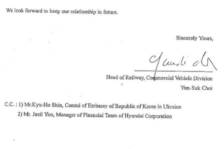 По данным журналистов, от имени АО "Укрзализныця" протокол подписал директор по пассажирским перевозкам Александр Толкачев, со стороны Hyundai Corporation – вице-председатель и СЕО Вон Габ Ким. Сумма контракта и условия приобретения поездов Hyundai не сообщаются.
