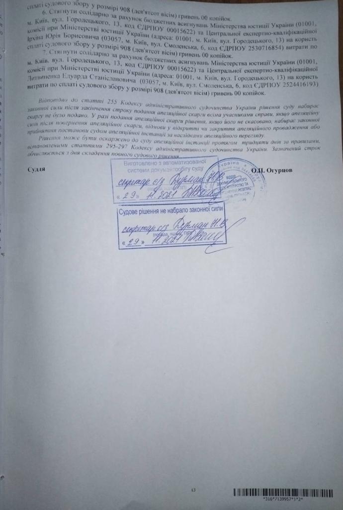Окружной административный суд Киева признал незаконным и отменил решение дисциплинарной палаты Центральной экспертно-квалификационной комиссии при Минюсте о приостановлении лицензий экспертов Юрия Ирхина, Анны Левчук и Эдуарда Литвиненко.