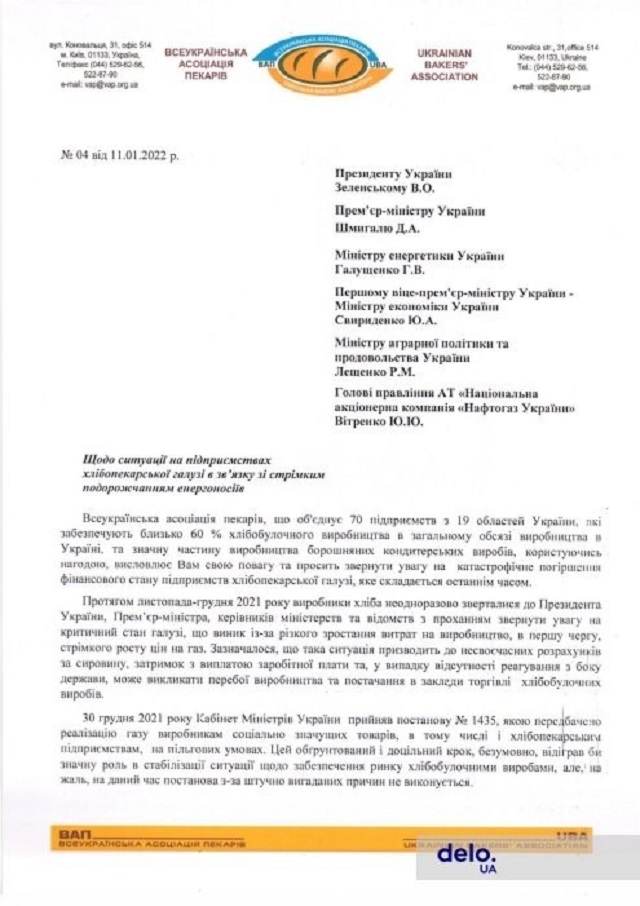 Фото - Обращение Всеукраинской ассоциации пекарей к президенту Зеленскому от 11.01.2022