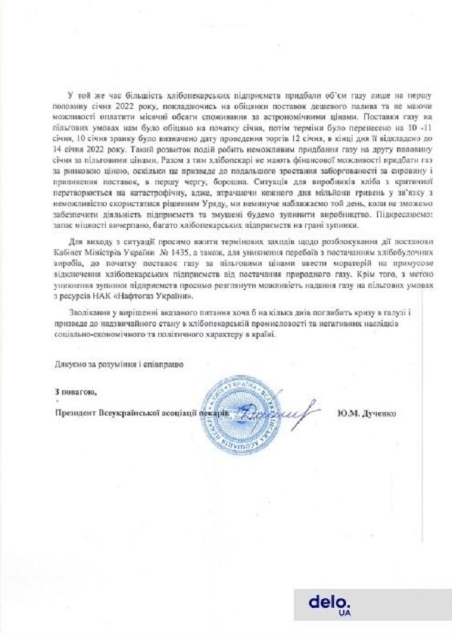 Всеукраинская ассоциация пекарей 11 января направила президенту Владимиру Зеленскому и премьер-министру Денису Шмыгалю официальное обращение с просьбой принять меры по разблокировке действия постановления правительства №1435, которое вводит льготные цены на газ для производителей социально значимых продовольственных товаров. В ассоциации поясняют, что постановление не выполняется поставщиками газа "из-за выдуманных причин" – хлебозаводы и другие производители социально значимых продуктов питания не получили контракты на покупку газа по льготной цене.