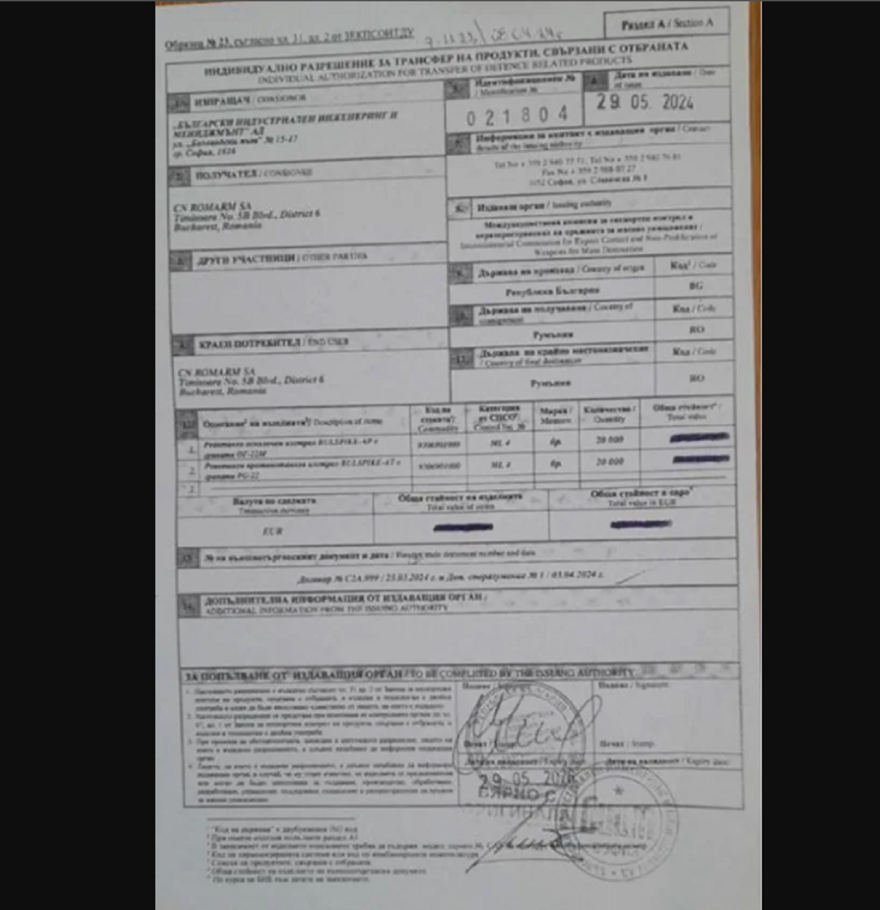 В доказательство журналисты предоставляют копию экспортной лицензии Болгарии: