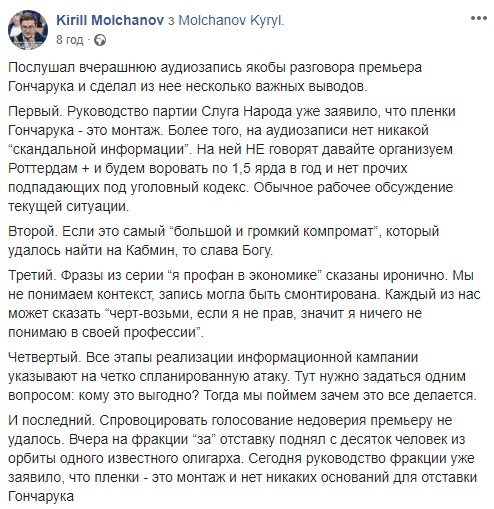 "Послушал вчерашнюю аудиозапись якобы разговора премьера Гончарука и сделал из нее несколько важных выводов. Первый. Руководство партии Слуга Народа уже заявило, что пленки Гончарука - это монтаж. Более того, на аудиозаписи нет никакой "скандальной информации". На ней НЕ говорят: "давайте организуем Роттердам + и будем воровать по 1,5 ярда в год" и нет прочих подпадающих под уголовный кодекс. Обычное рабочее обсуждение текущей ситуации", - отметил эксперт.