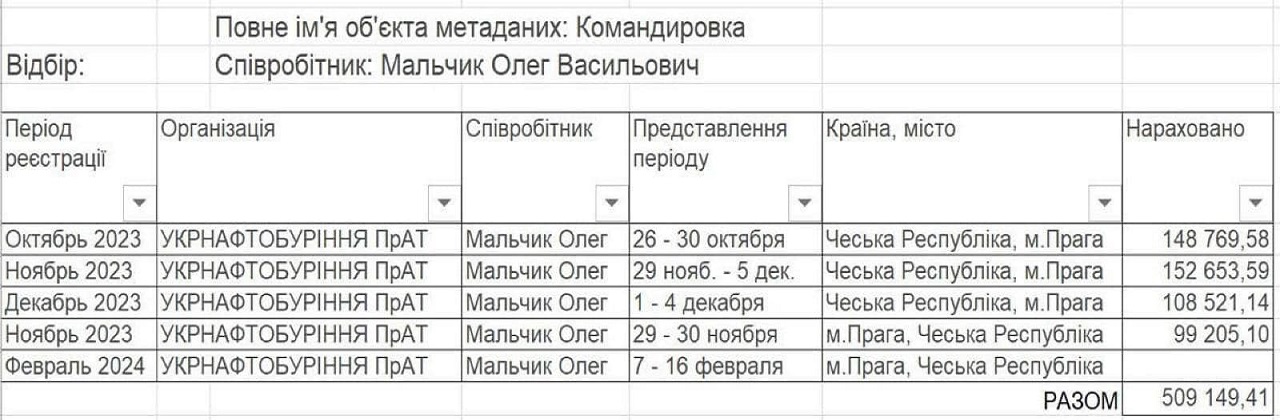 Полмиллиона гривен за 2 месяца – такую сумму государственных средств якобы на командировку в Прагу потратил за октябрь-ноябрь 2023 исполняющий обязанности главы правления государственной компании "Укрнефтебурение" Олег Мальчик, эти поездки оплатило государство за счет доходов временно переданной АРМА в управление Укрнефти компании, а только одна из поездок в октябре 2023 стоила предприятию 148 769 грн.