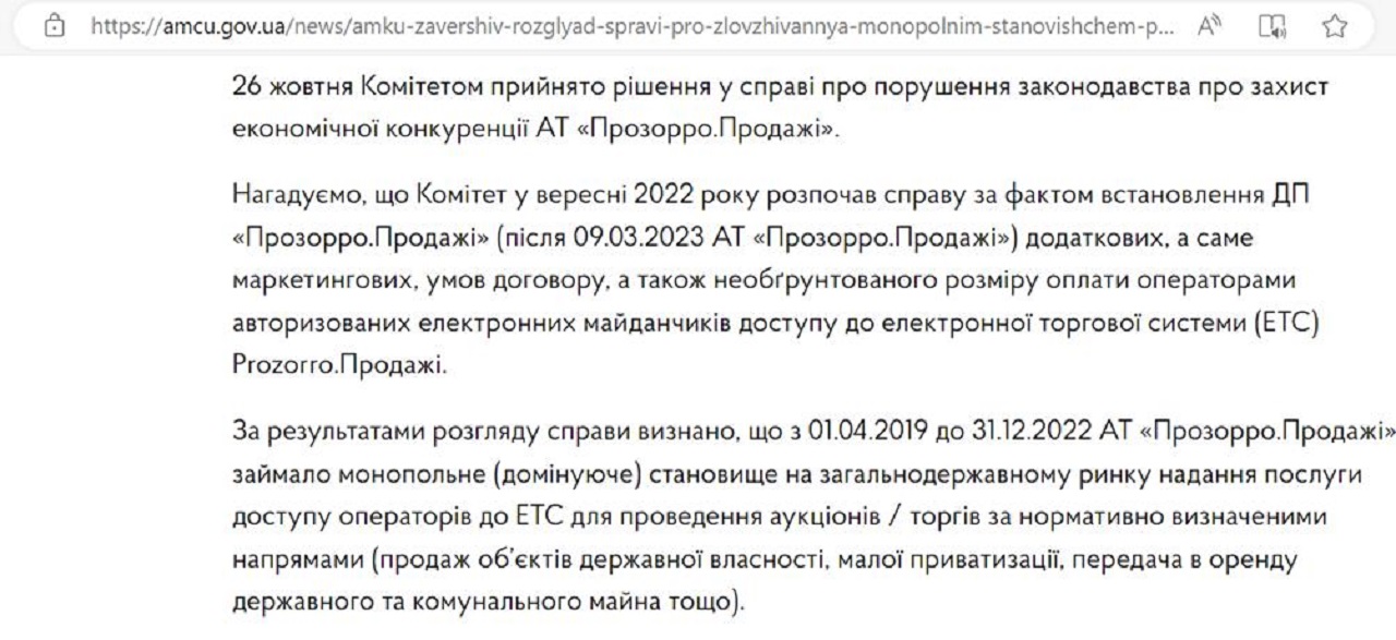 Дело было начато после жалоб электронных площадок, которые сетовали на необоснованное повышение со стороны ГП "Прозорро.Продажи" платы на развитие ЭТС и предоставления доступа к ЭТС Prozorro.Продажи только после выполнения площадками дополнительных условий (речь идет о маркетинговых обязательствах). В ходе расследования работники комитета нашли этому подтверждение.